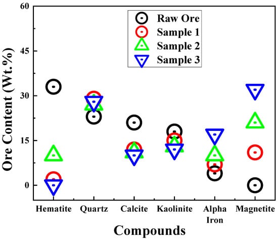 Figure 8 represents the data obtained from the Rietveld analysis of the samples, taking the ore’s main constituents under consideration. The data show the trends of the reduction of hematite, which was the main objective of reduction roasting.