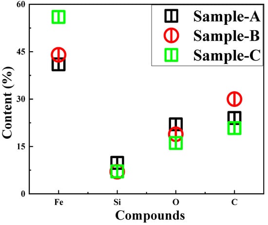 Moreover, sample C had a minimum magnetization of −1.51 emu, and as the percentage of iron decreased, so did the magnetization, as samples A and B showed magnetization of −0.76 emu and −1.15 emu. It is evident from these results that the percentage of iron influenced the magnetic properties, and the magnetic saturation tends to increase with the iron content.