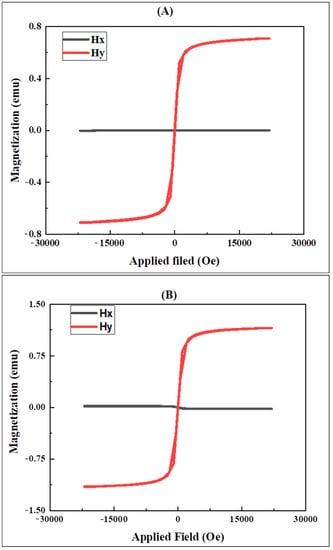 In Figure 11, it can be observed that the saturation of samples in the field of 23 KOe was successfully reached. For sample C, the maximum magnetization reached 1.51 emu, while in the case of samples A and B, a maximum magnetization of 0.76 emus and 1.15 emus was recorded.