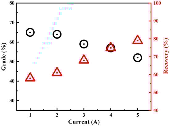 After magnetic separation, the concentrate and tailings were separated. Furthermore, moisture content was removed via filtration, followed by evaporation. The influence of magnetic separation on the grade and recovery of the concentrate was also evaluated by using Equations (4) and (5). Figure 12 presents the grade and recovery with respect to the drum wet weak magnetic separator’s current. As the grade increased, recovery showed a decreasing trend.