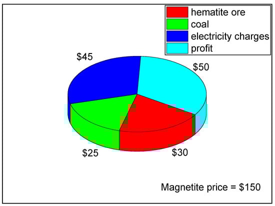 Multiple factors play a vital role in cost estimations [38], and Figure 13 presents a selection of the factors. Local industries in Pakistan pay around USD 140-150 per dry metric ton for iron ore with >60% iron as compared to hematite ore (having 45% iron content) at USD 50 per dry metric ton and coal at USD 120 per dry metric ton (coal with a 20 weight percent hematite concentration costs USD 24), and local electricity charges are USD 0.15 per kWh consumption; thus, 6 h for a single process (3 h for size reduction and classification, 2 h for the reduction roasting process, and 1 h for magnetic separation) would cost around USD 45 per process, as the electricity consumed will be about 50 kW for a single process [39]. This reduction of ore from hematite to magnetite in the given conditions (at a laboratory scale) costs about USD 119 for the whole process, as compared to USD 150 when purchasing magnetite directly from an international supplier. This cost can be further reduced by several orders of magnitude if the same technique is carried out at a larger commercial scale.