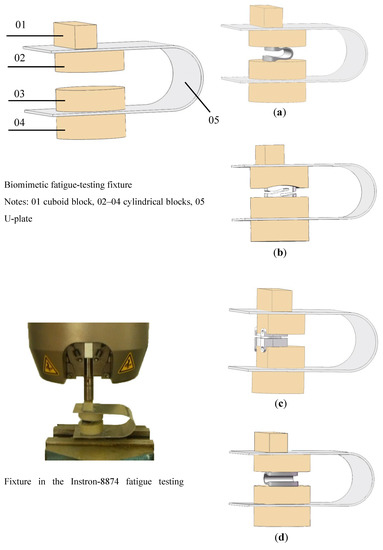 The optimized parameters of the biomimetic fatigue-testing fixture are as follows: 6061 Al alloy is suitable for the U-plate 05; the thickness and width of the U-plate 05 are 1 mm and 30 mm; the hydroxyapatite-filled epoxy block 01 is a 25 mm long, 10 mm wide and 10 mm high cuboid; the radius and height of the hydroxyapatite-filled epoxy cylindrical blocks 02–04 are 12 mm and 10 mm; and the distance between the center of the cylindrical blocks 02–04 and the rear end of the U-plate 05 is 50~55 mm.