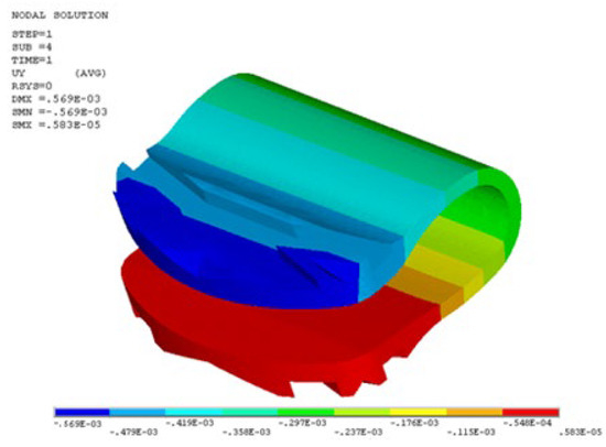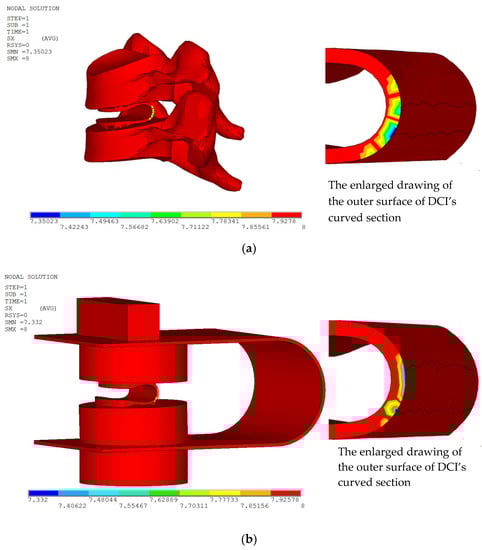 In the numerical calculation of the equivalent stress and deformation of DCI within the C5–C6 cervical spinal segments during the static test, the maximum routine loading parameters in biomechanical tests with cervical spines from cadaver donors were followed; namely, a 73.6 N preload was applied to the top surface of C5, with an extra 1.8 Nm flexion moment for flexion movement and a 1.8 Nm extension moment for extension or a 1.0 Nm lateral bending moment for bending, respectively, while the bottom surface of C6 was fixed in six degrees of freedom in the finite element model [26,27,28].