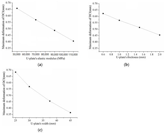 Influence of the U-plate’s elastic modulus and size on the DCI’s maximum deformation: (a) U-plate thickness and width were fixed at 1 mm and 30 mm; (b) elastic modulus and width at 70,000 MPa and 30 mm; (c) elastic modulus and thickness at 70,000 MPa and 1 mm.