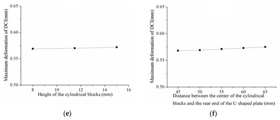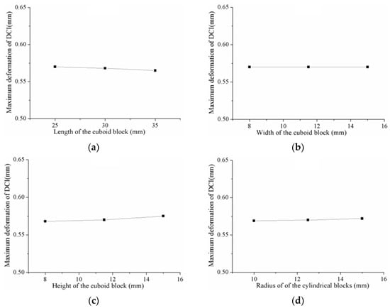 Influence of the geometric sizes and position of the blocks on the DCI’s maximum deformation: (a) the length of the cuboid block; (b) the width of the cuboid block; (c) the height of the cuboid block; (d) the radius of the cylindrical blocks; (e) the height of the cylindrical blocks; (f) the distance between the center of the cylindrical blocks and the rear end of the U-plate, assuming other factors being equal.