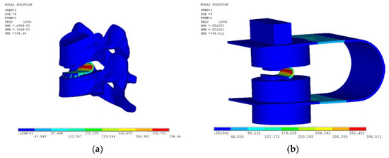 The contours of the equivalent stress of pure Ti DCI under the flexion condition: (a) within C5–C6 cervical spinal segments; (b) within the fatigue-testing fixture.