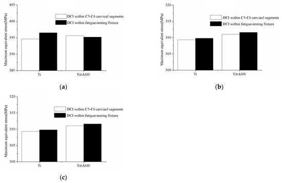 The contours of the equivalent stress of pure Ti DCI within the C5–C6 cervical spinal segments and within the optimized fatigue-testing fixture under the flexion condition are shown in Figure 5. The maximum equivalent stress of pure Ti DCI within the fatigue-testing fixture was 396.5 MPa, which agreed well with 394.6 MPa, the result of DCI within the C5–C6 cervical segments. More importantly, both maximum equivalent stresses appeared in the same location of the DCI. Furthermore, the contours of the equivalent stress of the DCIs of pure Ti and Ti6Al4V were simulated under various loading conditions within the fatigue-testing fixture, which were similar to those of the DCIs within the C5–C6 cervical spinal segments, as plotted in Figure 6.