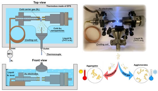 The generation of nanoparticles using the electrical erosion of electrodes in gas is a relatively facile, scalable, and material-universal synthesis method [1,2]. This method is widely used to obtain aerosol nanoparticles and mix them [3,4] with further application in spectroscopy [5,6], printed electronics [7,8], and functional coating [9]. The features of this method are the chemical purity and the small size of the synthesized nanoparticles (less than 10 nm), and clusters containing up to tens of atoms [10]. However, after generation, the primary nanoparticles inevitably rapidly agglomerate, which can be a limiting factor for many applications. This paper challenges this paradigm by providing experimental evidence that agglomeration can be controlled by controlling the temperature of the carrier gas. Thus, it is possible to limit the cooling rate and Brownian motion of the nanoparticles, and synthesize either aggregates or agglomerates [11]. The nanoparticles tend to aggregate and agglomerate, due to the attraction between nanoparticles such as van der Waals forces and chemical bonds [12]. Both aggregation and agglomeration are assemblies of nanoparticles, where aggregation includes strong and dense colonies of particles, but agglomeration comprises loosely combined particles that can be disrupted by mechanical forces [13]. Aggregates or agglomerates of nanoparticles are known to be preferred in applications such as catalysts [14,15,16] or sensors [17,18,19,20] because they have a large surface area. However, such particles are unsuitable for use as building blocks of conductive structures because they cause various problems such as low packing density and low electrical conductivity.