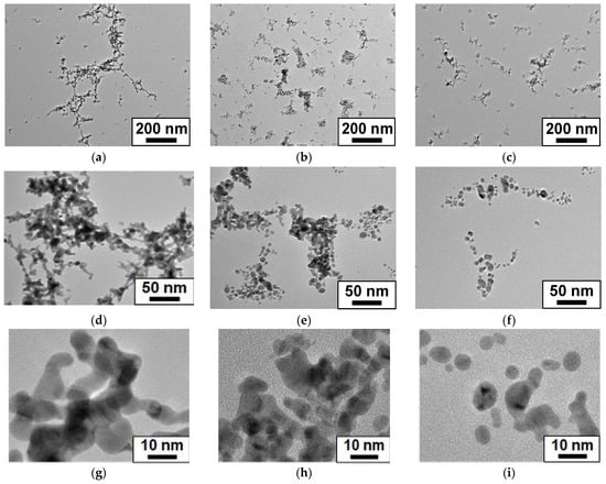 TEM images of Au nanoparticles obtained by spark discharge in chamber with gas temperatures of 24 °C (a,d,g), −111 °C (b,e,h), and −183 °C (c,f,i).