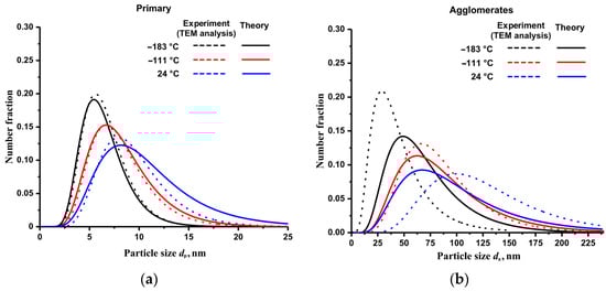 Distribution of primary particles (a) and agglomerates (b) by size at nitrogen carrier gas temperatures of 24 °C, −111 °C, and −183 °C, plotted from experimental (TEM analysis) and theoretical data.