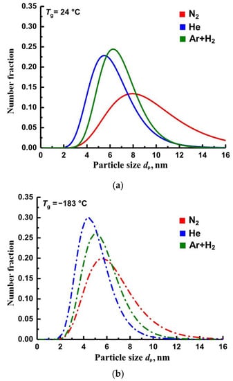 Similar to the data presented in Figure 4a, experiments were performed to determine the particle size distribution for nanoparticles obtained in nitrogen, argon, and helium gases (see Figure 5) at room (24 °C) and cryogenic (−183 °C) temperatures, respectively. Figure 5 shows that at these temperatures, the smallest size of primary particles is achieved when using He, and the largest when using N2. Theoretically, this is explained by an increase in dynamic viscosity during the transition from nitrogen to helium, and hence a decrease in the coagulation coefficient K, see Formula (3).