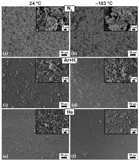 In order to establish the influence of the type of carrier gas and its temperature Tgas on the functional properties of nanoparticles, gold nanostructures were printed from nanoparticles obtained in N2, He, and Ar + H2 at temperatures of 24 °C and −183 °C, followed by study on a Raman spectrometer. Figure 6 shows scanning electron microscopy (SEM) images of sections of SERS structures formed from gold nanoparticles [9], which were synthesized in N₂, Ar + H2, and He atmospheres at temperatures of 24 °C and −183 °C. It should be noted that the structures were formed during the same time interval of about 1 min. The SEM images show that the type of carrier gas significantly affects the density of the formed structures. The densest SERS structures are formed from nanoparticles synthesized in a nitrogen atmosphere, see Figure 5. This result is explained by the fact that agglomerates obtained in nitrogen have large sizes (>100 nm) and, as a result, are deposited much more efficiently through a micronozzle onto a substrate in comparison with small nanoparticles obtained in argon and helium. Moreover, the mass production of nanoparticle synthesis in nitrogen is also higher (42–59 mg/h) than in argon (35–39 mg/h) and helium (18–21 mg/h) (see Table 4). This is also the reason for the formation of denser structures.