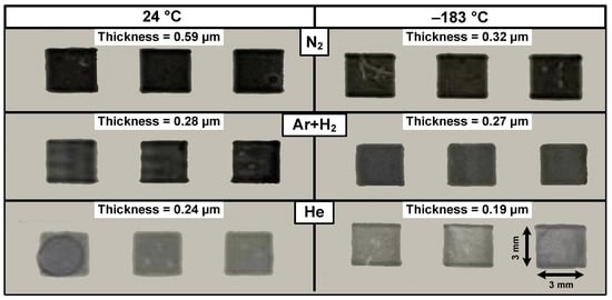From the results of measurements of the thicknesses of SERS structures using an optical 3D profilometer, it is also seen that the structures printed with Au nanoparticles synthesized in nitrogen have higher values in comparison with the structures of nanoparticles for argon and helium (Table 4). A similar difference is observed when comparing SERS structures formed from nanoparticles at temperatures of −183 °C and 24 °C. From the analysis of SEM images, it can be seen that at a synthesis temperature of −183 °C, the microstructure of the formed SERS structures is more homogeneous and uniform, while at a synthesis temperature of 24 °C, many individual large particles are deposited on the substrate. Figure 7 shows photographs of SERS structures in the form of 3 mm × 3 mm square pads of gold nanoparticles synthesized in various gases at 24 °C and −183 °C.