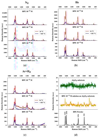 Raman spectra for BPE obtained on SERS structures of Au nanoparticles synthesized in various gaseous media (N2 (a), He (b) and Ar + H2 (c)) spectra are scaled in pairs at temperatures of +24 °C (red) and −183 °C (blue), and group of spectra (d) of an alumina substrate (green), of a 10−1 mol/L BPE solution (orange) supported on alumina, and of a dry BPE powder (black).