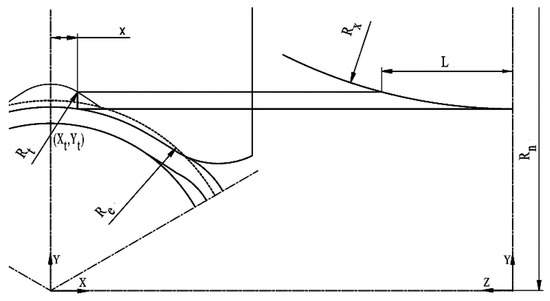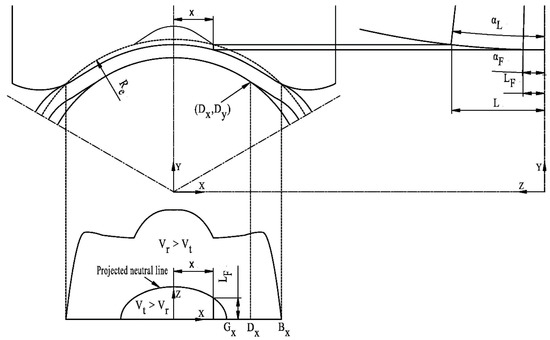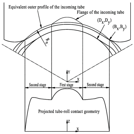 Since the tube profile and the roll groove profile are composed of circular arcs, the solution for the tube-roll contact geometry can be transformed into a space analytic geometry problem. For the contact boundary formed corresponding to the first stage (see Figure 2), the projected contact length L at a given x-coordinate can be calculated as follows: