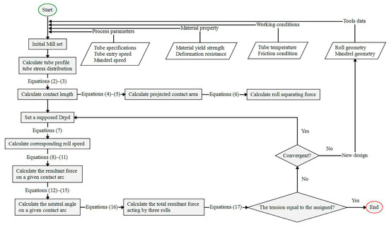 The proposed model has been implemented into a computer application to supply the setting data and checking data for an assigned rolling schedule. To determine the roll pitch diameter in the model, the end condition of the iterative calculations is that the calculated tension at the stand outlet is equal to the assigned value. The related calculations are conducted by following the flowchart as shown in Figure 6.