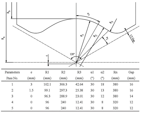 The tube specimen for measurements of the tube-roll contact geometry was obtained by a deliberate emergency stop of a five-stand three-roll mandrel mill, when the rolling was at the steady normal rolling state with no obvious inter-stand traction being observed from the roll force curves in field operation. The primary processing parameters in the experimental rolling schedule is shown in Figure 7, and the geometry of the grooved roll used in experimental rolling is shown in Figure 8.