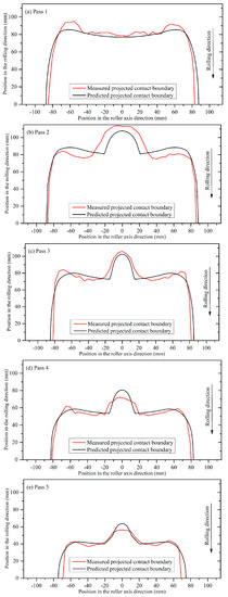 Comparison of the measured and predicted projected tube-roll contact boundary. (a) Pass 1, (b) Pass 2, (c) Pass 3, (d) Pass 4, and (e) Pass 5.