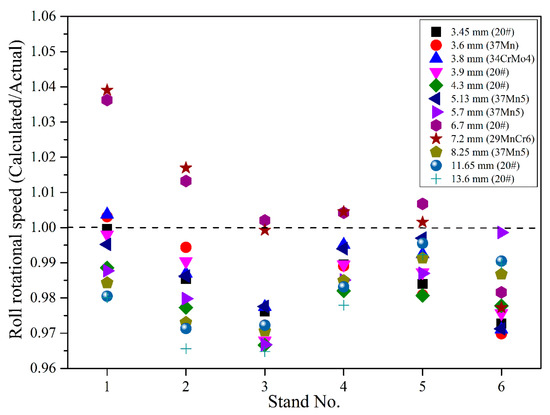 As can be seen from the comparison, the calculated results agreed well with the satisfactory actual roll rotational speed in field operation. In the involved experimental rolling cases, the maximum additional adjustment of the roll rotational speed in field operation was 3.9%, i.e., the maximum ratio of the calculated Vrpm to the actual satisfactory Vrpm in field operation is 1.039, which is at the roll pass 1 corresponding to the rolling schedule, with the finished tube wall thickness being 7.92 mm and the steel grade being 29MnCr6 (see Figure 11).