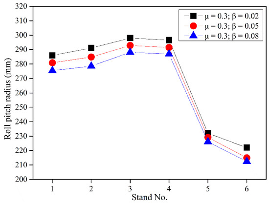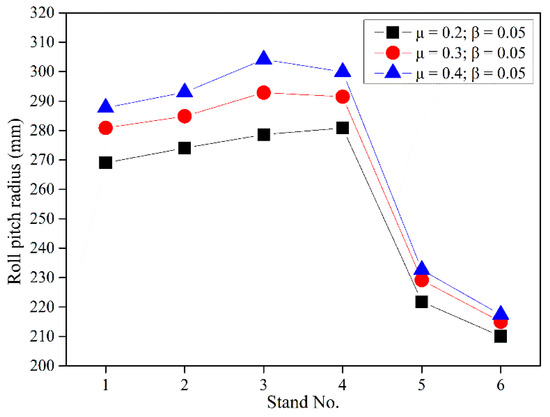 Through further calculations based on the results shown in Figure 12, it can be found that the maximum changing amplitude of the theoretical roll pitch diameter corresponding to the commonly used data range of the tube-roll friction coefficients is at pass 3. To be precise, the maximum ratio of the maximum roll pitch diameter to the minimum roll pitch diameter at pass 3 is 1.092. This result indicates that the tube-roll frictional coefficients have a significant effect on the calculated results of the roll pitch diameter. Thus, to decrease the additional adjustments of roll setting in field operation, the tube-roll coefficients used in the equations should be assigned properly. By substituting different tube-mandrel frictional coefficients which are in the commonly used data range into the equations, the corresponding calculated results of the roll pitch radius can also be obtained (see Figure 13).