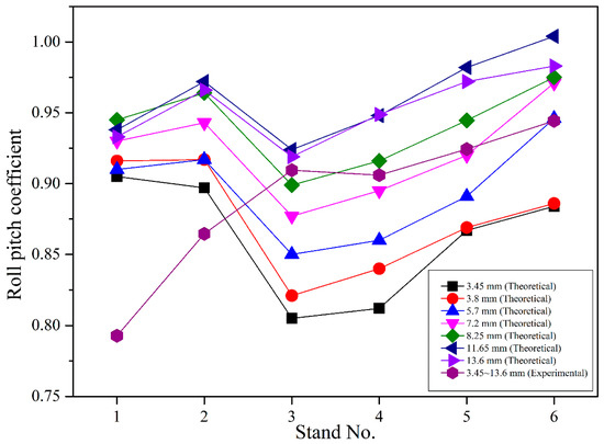 Because of the complexity in the analysis of the physical system of continuous retained mandrel rolling, the empirical model has been widely used in tube manufacturing rather than the analytical model for determining the roll pitch diameter. The most commonly used empirical model was formulated as Equation (1), in which the experimental coefficient was assigned specifically for each stand and mandrel. Corresponding to the experimental pitch coefficients, to compare the proposed analytical model with the conventional empirical model conveniently, the so-called theoretical pitch coefficients can be conversely calculated by using the analytically calculated data of the roll pitch diameter and Equation (1).