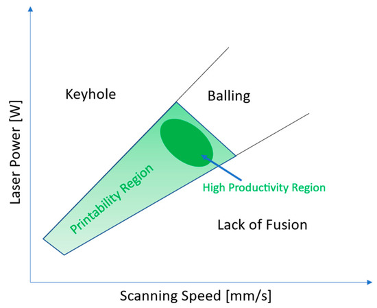 During the characterization phase of the material in L-PBF, in order to avoid the presence of defects such as porosity [22] or cracks [23,24,25,26], which could severely affect the microstructure and mechanical properties of the material, many aspects of the printing process have to be studied [19]. Among these, the identification of the printability window [27,28] (Figure 1) is necessary and fundamental to have a material that is fully dense and free of processing-related defects [19]. The presence of these defects generates a modification in the mechanical properties of the materials [29]. The defect-free printability zone is identified by selecting the proper set of process parameters to ensure a proper melting of the powder bed.