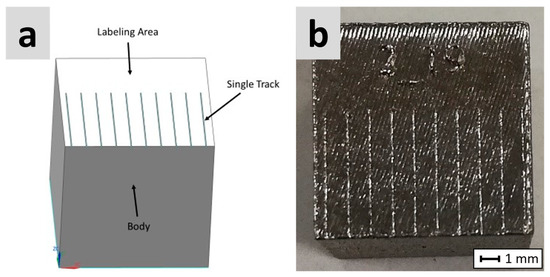 The tracks’ width is chosen to expose this part of the model as a single and continuous hatch. The spacing between the tracks is determined to avoid an overlap of the melt pool. As for the length of the tracks, it must be enough to label the top of the specimens; in our case, it is 6 mm.