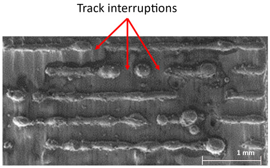 - Check for interruptions along the tracks (in this paper it is considered interruptions the non-melting of powder for at least ten microns of length); all the tracks with an interruption must be considered unstable (Figure 5)