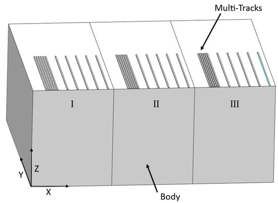 A specific model is realized to investigate different levels of hatch distance, as shown in Figure 9. A thick plate characterizes the model split into many sub-parts equal to the number of hatch levels; in Figure 9, three levels of hatch distances (I, II and III) are investigated. A set of multi-tracks and single tracks (equal or greater than five) are printed on the top surface of each sub-part using the procedure described in Section 2.1.2.