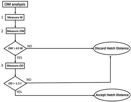 Consequently, using the multi-tracks analysis, it is possible to evaluate quickly based on the geometric dimensions of the overlap area (OD and OW) if the hatch distance value selected for the configuration of laser power and scanning speed investigated is acceptable or not (Table 8 and Table 9).