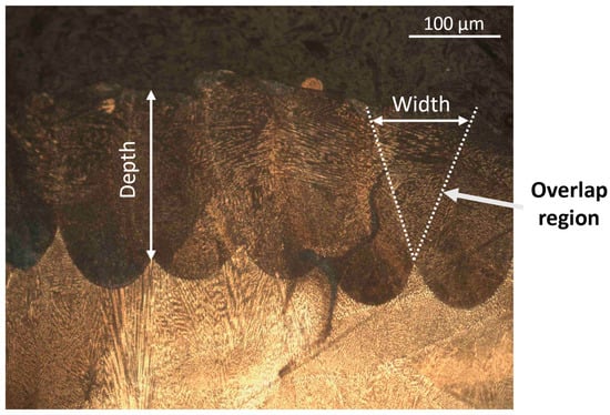 In order to evaluate the melt pool shape, the specimens are etched using oxalic acid or a similar acid. The specimens are then analyzed using an optical microscope. For the assessment of the melting regime of powder, the depth and the width of the melt pool are measured; see Figure 8a,b. Using these dimensions to calculate specific parameters makes it possible to identify the heat transfer regime for each specimen [38]. The shape of at least five random single tracks is analyzed to evaluate process variability.