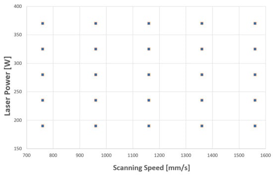 A 2D grid of experimental points is created using a DOE approach to study laser power and scanning speed effects. In particular, the range of the parameters can be chosen using results present in the literature or obtained by commercial simulation tools. This also applies to the selection of hatch distance range which is kept fixed in this phase. The number of grid points depends on the number of levels to investigate the scanning speed and laser power. So, depending on the level of accuracy required in the study, the grid may have different levels investigated.