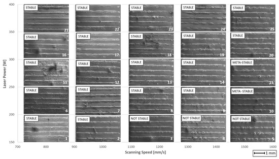 The stability of a single track is evaluated using a SEM image; each acquisition is carried out with a 40× magnification. Then, a track stability map is created using the SEM-acquired images.