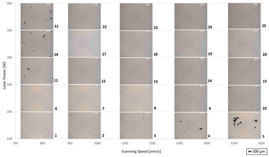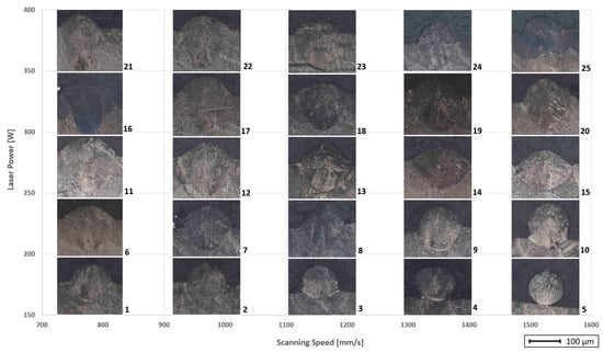 The expected outcome of this analysis is to select among the specimens analyzed the one that presents a conductive regime; if more than one configuration satisfies this condition, choose the specimen that is most appropriate for the activity under consideration (e.g., maximum of productivity). This step’s results permit identifying the specimen with the best laser power and scanning speed value.