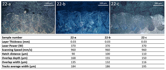 Relative to hatch distance optimization, using multi-tracks analysis results, it is possible to notice that for the specimens with a higher value of scanning speed with the same laser power, the dimensions of the depth and the width of the overlap zone between the tracks decrease as the hatch distance value increases (Figure 15).