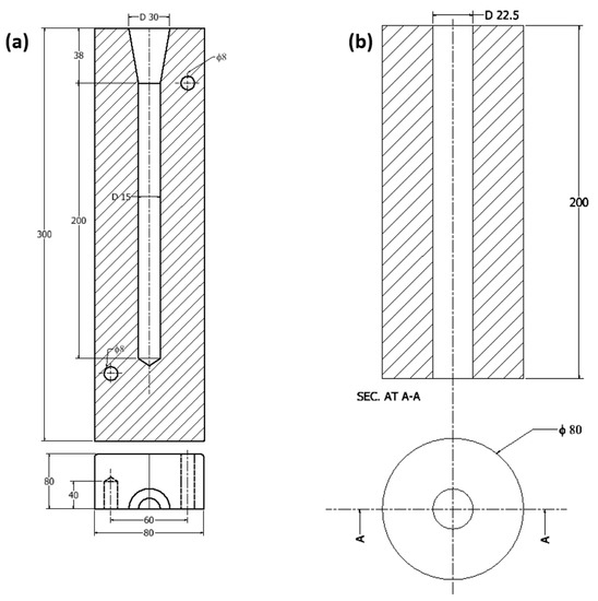 The aluminum segments were placed in a small ceramic crucible and then placed in an electric furnace with a maximum heating temperature of 1500 °C. The metal was heated to 650 °C. The molten metal was kept at this temperature for 2 h to achieve sufficient homogeneity and solubility [22]. This temperature was above the melting temperature of 580 °C [23]. This temperature was chosen to allow enough time to mix the ceramic additives— alumina Al2O3 and silicon carbide SiCp particles (supplied by El-Gomhouria for Medicines and Medical Supplies, Cairo, Egypt) (Swith a size of almost 40–60 µm—based on heat and mass transfer criteria [24]. The crucible was then removed from the oven and placed in the chamber of the electric mixer (see Figure 1), and the agitator was switched on while the ceramic additives were poured in. The electric mixer was made so that the metal did not splash out during the mixing and stirring process. To prevent a large temperature loss, the ceramic fan was preheated to the same temperature, and the ceramic additives were added to the furnaces to achieve the same temperature of the molten metal. The stirring process took less than 30 s, and then the crucible was poured into the molds. There were two types of molds: H13 Steel alloy of 24.3 W/m.K thermal conductivity and of 0.460 J/g-°C specific heat [25] (Figure 2a) and synthetic graphite (petroleum coke, needle coke, coal pitch, etc.) of 121.1 W/m.k thermal conductivity [26] and of 1.732 J/g °C specific heat [27] (Figure 2b). The castings produced were like the aluminum alloy without any additives (0%), while the Al2O3 and SiC particles were added at 0.5 wt.%, 1 wt.%, 2 wt.%, 3 wt.%, 4 wt.%, and 8 wt.%. It is known that these ceramic additives do not dissolve in the aluminum matrix due to the large differences between melting temperature and density; therefore, the cast product can be called a metal matrix composite [14,28,29]. The cast products had a cylindrical shape of 238 mm × 15 mm for casting in a steel mold and 200 mm × 22.5 mm for casting in a graphite mold.
