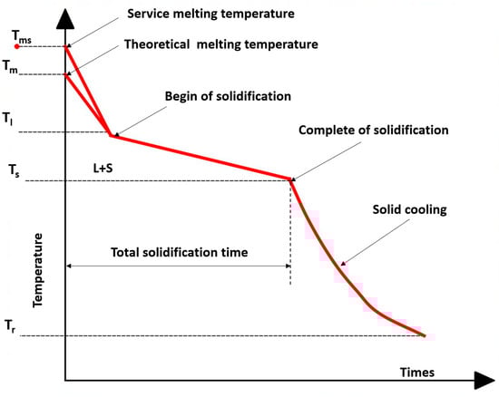 The mechanism of heat transfer during casting depends on the solidification process, the cast metal, and the thermal radiation [30]. These dynamics can be explained by the cooling curve shown in Figure 3. The heat loss during the casting process up to Tl, known as the cooling temperature of the liquid or the beginning of solidification, is mainly due to the turbulent flow in the molten metal to compensate for the longer time needed for mixing the additives and the stirring process; this point is smaller than Tms. The rate of solidification in this range is linear, and the amount of heat is minimal. Solidification begins on contact with the molds at Tl, then continues gradually until it solidifies completely at temperature Ts. The castings are left in the molds until they have cooled completely to room temperature Tr. This normalizes the grain size of the product in the molds, and the boundary conditions are as homogeneous as possible. The solidification process progresses over time. The time at which the temperature of the molds rises significantly to the maximum temperature is the same as when the molten metal reaches the liquidus point. Therefore, a thin layer forms over the outer casting surface, and then the metal shrinks and an air gap is interrupted between the mold and the metal.