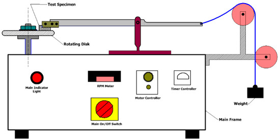 The wear test is performed with a pin on a disc according to the ASTM G99-05 standard [38]. The test was performed on all cast products. Figure 4 shows a general view of the wear test machine (SSITOM-012-Pin On Disc Wear Apparatus, Saini Scientific Industry, Haryana, India) [14]. It consists of a horizontal steel disc with an inner diameter of 50 mm, an outer diameter of 100 mm, and a thickness of 2 mm, which rotates and is driven by a variable-speed motor. A specimen holder connected to the loading lever and pressed against the rough counter surface is used to hold the specimen. The load is applied with a dead weight of 1600 g at a 3.5 m/min and 5 m/min linear speed at 5 min contact time. The surface of the sample was polished with 1000-grit emery paper to remove any unevenness or impurities. The initial weight was then measured with an accuracy of 0.001 g, and the sample was fixed in the play as a 12 mm diameter pin. In addition, 80-grit emery paper with a surface roughness of 1.80 × 10−6 was glued to the opposite side of the steel disc with epoxy glue; then, the pin (the sample surface) was contacted in a dry state and not lubricated. The motor speed was 400 rpm.
