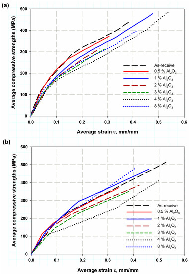 Average stress and strain relation for the Al-Si-Mg alloy filled with Al2O3 in (a) graphite mold, (b) a steel mold.