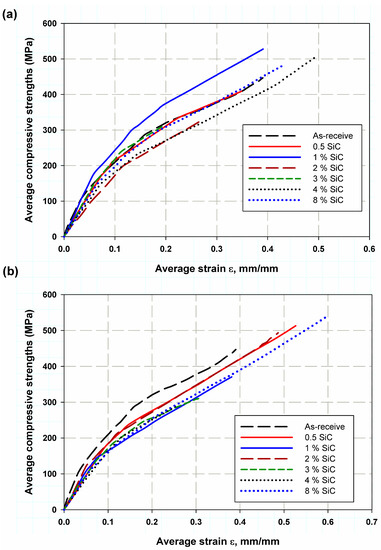Average stress and strain relation for the Al-Si-Mg alloy filled with SiC in (a) graphite mold, (b) a steel mold.