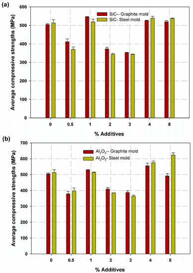 Vicker’s hardness variation with different ceramic additives: (a) graphite mold, (b) steel mold.