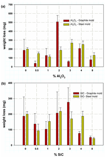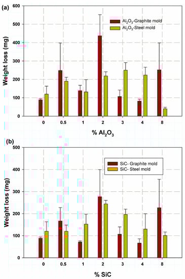First of all, it is well-known that wear tests involve a variety of individual concepts, and many factors can influence material performance [47]. Therefore, various trends were observed. In general, it was found that most percentage standard errors were high because many factors affect the wear test, such as the type of interfaces, surface finish of the material, types of material, machine speed, vibration-specific heat, and thermal conductivity of the material. It was found that, in general, casting in a steel mold at a sliding speed of 3.5 m/min (see Figure 10) and 5 m/min (see Figure 11) resulted in a higher wear rate than casting in a graphite mold. This was attributed to the fact that when casting in a graphite mold, a graphite element diffuses through the Al alloy matrix, as high temperatures and good contact favor the diffusion and wettability of the aluminum [48], so graphite acts as a solid lubricant that reduces the effects of wear. In addition, the low cooling rate in graphite molds was the main reason for the coarsening of the grain size of the Al-Si-Mg alloy so that it absorbed some of the shear stress such as dumpers, resulting in a reduction in the wear loss. In contrast, when casting in steel molds, the heat loss is higher due to the higher heat transfer from radiation and the lower specific heat of the steel mold. This higher cooling rate resulted in grain refinement, especially near the mold wall [16]. In Figure 10a and Figure 11a,b, it can be found that the 2 wt.% Al2O3 and SiC almost gave a maximum average weight loss. It was 506.66 mg with an SDV of 123.5 mg and a minimum standard error of 71% for the Al-Si-Mg alloy cast in a graphite mold filled with Al2O3 at a sliding speed of 3.5 m/min (Figure 10a), while it was 436 mg with an SDV of 200 mg and an error of 115.5% error for the alloy filled with Al2O3 also cast in a graphite mold but at a sliding speed of 5 m/min (see Figure 11a). Furthermore, the SiC at 2 wt.% shows the same trend, as the average wear loss was 776.6 mg with an SDV of 212 mg and 122% error, even when cast into a graphite mold. In contrast, the addition of 3 wt.% SiC to the Al-Si-Mg alloy increased the weight loss to a maximum value of 276 mg with an SDV of 160 mg and 92% error when also cast in a graphite mold and at a sliding speed of 3.5 m/min. It was also observed that most Al-Si-Mg alloys filled with SiC particles had a weight loss of less than 200 mg, as SiC reacts with the aluminum according to the reaction shown below, resulting in wettability of the aluminum and an increase in the amount of Si in the aluminum matrix itself [48], while Al4C3 increased the amount of carbon, which acts as a solid lubricant.
