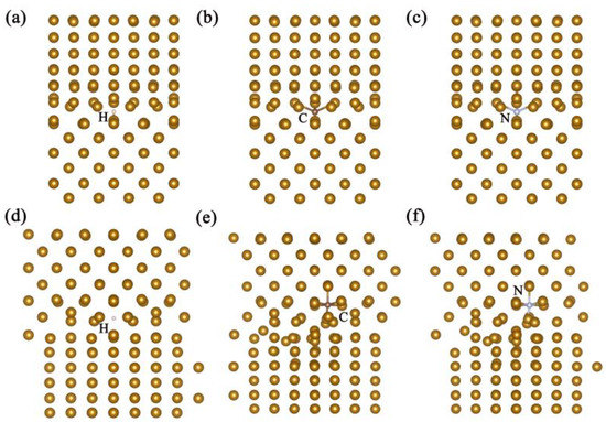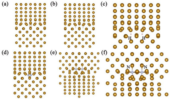 The atoms will move away from each other and enter adjacent gap sites instead of joining together (see Figure 5). Similar to the case of one hydrogen atom, two hydrogen atoms will move away from each other and enter the adjacent gap, while the nitrogen atoms will enter the two octahedral gaps in the austenite after optimization. This is because the hydrogen atom has a small radius and only one electron [26], which allows it to stay in the interstices of the interface and interact with multiple iron atoms. This is also a result of the capture effect. The 1s half-full state causes electrons moving freely in the crystal field to be attracted to the positively charged hydrogen nuclei. As a result, it is difficult for hydrogen to escape from the trap. Hydrogen atoms are not attracted to each other, because of the enormous coulomb forces, which allows these hydrogen atoms to be dispersed at various places of the interface. On the other hand, the radius of a nitrogen atom is larger than that of hydrogen and its valence electron layer is half full, so it tends to enter austenite, which has been confirmed by numerous studies [62,67,68].
