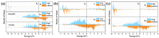 Metallurgical junctions are formed by distortion of atoms in the two layers near the interface when the FCC and BCC lattices are bonded together. This bonding makes the spin polarization of the atoms at the interface more pronounced. In other words, metallurgical junctions are allowed to form because electrons at the interface change their spin patterns, as shown in Figure 1b. More electrons gather at the interface because the otherwise perfect lattice is distorted to allow pairing with another lattice (see Figure 1c). This charge enrichment is the reason why the interface has strong binding energy (~−29.4801 eV). Anisotropy is introduced into the system [59] because of this combination, which makes stainless steel have high mechanical strength and excellent corrosion resistance [60]. However, lattice distortion changes the gap at the junction, resulting in a greatly increased probability of atoms with smaller radius entering. This junction becomes a significant weakness in the material despite the strong bond between the two phases. Therefore, hydrogen embrittlement may occur in duplex stainless steel regardless of the phase combination [60]. These are closely related to the behavior of atoms at the interface. For example, Chan et al. [61] suggested that the austenite–martensite interface could capture hydrogen more efficiently than the residual austenite because the hydrogen concentration of retained austenite changes slightly with the increase in carbon content. An important fact is that the austenitic–ferrite interface plays a key role in the hydrogen exchange between adjacent sides, although Turk et al. [15] believed that it was uncertain whether the austenite could be treated as a point trap simply.