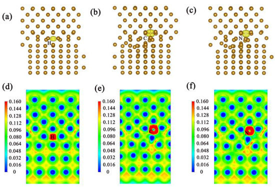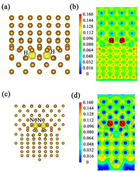 Then, the binding energy, cohesion energy, and enthalpy of formation are shown in Table 2. The DOS and ELF with the presence of two hydrogen/nitrogen atoms at the interface were calculated (see Figure 6 and Figure 7).