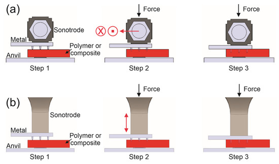 The U-Joining process can be divided into three phases, independently of the vibration mode applied. Figure 1a,b illustrate the steps at which horizontal and vertical vibration are used, respectively. In Step 1, the parts are placed between the sonotrode and the anvil, with the structured surface of the metal facing the upper surface of the polymer or composite. In the case of horizontal welding, a sonotrode that allows the assembly of a replaceable tool can be used. For vertical joining, the sonotrode normally acts directly at the upper surface of the metallic connector. In Step 2, the sonotrode starts vibrating, and vertical pressure is applied against the parts. The principle of heat generation for both variants is based on the conversion of high-frequency mechanical vibration into heat through (i) combined contact surface at the metal-polymer interfaces, initially between the TTRs’ tips and the polymer surface, and then, after full insertion of the TTRs, between the metallic and polymer flat surfaces; and (ii) intermolecular friction (i.e., viscous dissipation) within the polymer or composite material [10,11,12]. Consequently, a portion of the polymer close to the interface melts or softens (depending on whether semi-crystalline or amorphous polymers are joined), allowing the TTRs insertion into the polymer or composite material. Step 3 is the consolidation phase. As soon as the TTRs are entirely inserted into the polymer, the vibration is interrupted and the pressure is kept constant until the softened or melted layer solidifies. At the end of the process, the sonotrode retracts and the joining cycle is concluded. The produced joints are held by the combined effects of three different mechanisms: macromechanical interlocking due to the presence of TTRs, micromechanical interlocking at the rough metal-polymer interface, and adhesive forces created by the consolidation of the molten layer [8].