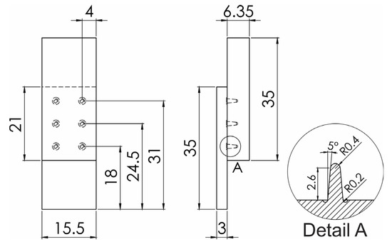 Figure 2 shows the dimensions of the connectors and a detailed view of one of the six round-tip conical TTRs used in this work, which was based on previous studies [6,7,8,9]. An undercut with a radius of 0.2 mm was applied at the base of the pins to shift the stress concentration from this region and improve the mechanical interlocking between the materials after the joining process.
