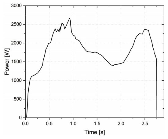 As previously mentioned, the U-Joining parameters had already been optimized for horizontal welding using the selected material combination and the energy control mode (the selected parameters are presented in Table 4). As defined by Benatar [17], modern ultrasonic welders operate in a closed loop when using this mode, where the power dissipated in the ultrasonic transducer is measured and integrated along the joining cycle until the desired EJ is achieved (area under the time x power curve). The obtained curve for this optimized horizontal condition is presented in Figure 3. The curve also confirms that the joining cycle for the optimized condition is approximately 3 s, where the vibration is completely ceased.