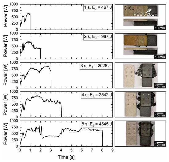 Further tests to reduce EJ using the energy mode resulted in poor process control, as large discrepancies were observed in the joining time when multiple joints were produced using the same EJ value. Additionally, other studies have reported that the time mode provides better process control when vertical vibration is used (as the process is less dependent on the surface condition due to lower friction between the sonotrode and the joining parts) [10]. Consequently, the time control mode was selected for the vertical variant to improve the process reliability. The joining time (JT) was optimized via OFAT analyses, in which its influence on the joint formation was assessed, aiming to compare the joint’s behavior and energy input along the joining cycle. The obtained time x power curves for five different JT values (1, 2, 3, 4 and 8 s) are presented in Figure 4. The EJ values (area under the curves) are also included for each condition.