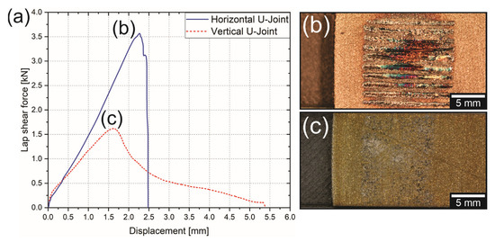 Quasi-static lap shear tests were conducted with samples produced using the optimized conditions for both variants to compare their mechanical performance. Representative force x displacement curves are presented for both conditions in Figure 5a, as well as an overview of the produced horizontal (Figure 5b) and vertical (Figure 5c) joints. By analyzing the top view of the U-Joint presented in Figure 5b, one can observe that marks resembling the tool geometry are left on the surface of the metallic connector when horizontal vibration is used. On the other hand, Figure 5c indicates that such strong grooves are not produced in the vertical variant for a JT of 2 s. This difference indicates that the vertical mode represents a good solution to minimize the intense tool wear reported in the literature [8,18] when the horizontal mode is used.
